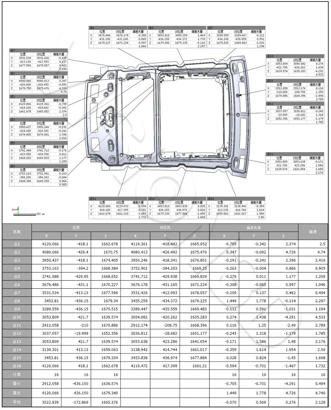 在汽車頂蓋件的制造過程中,鈑金不可避免的會出現(xiàn)回彈或變形。因此,對其型面、輪廓及孔位等關(guān)鍵尺寸進行精度檢測,將檢測數(shù)據(jù)進行深度分析,用以生產(chǎn)工藝的優(yōu)化,保障制件成型精度,避免影響后續(xù)裝配工藝。