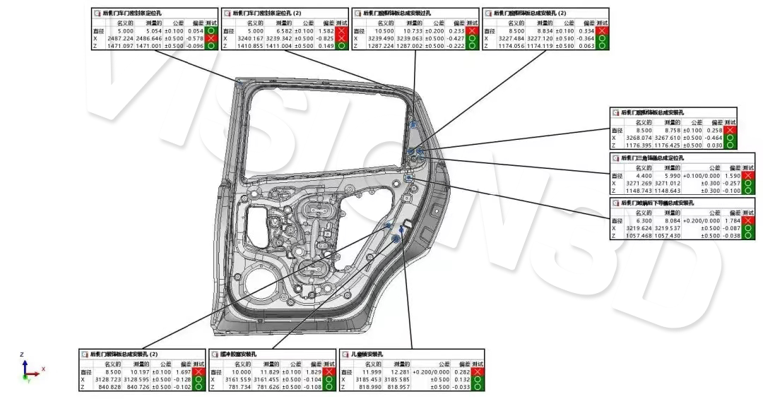 乘用車車門鈑金件可實現(xiàn)全尺寸檢測,單件檢測時間縮短為3至5分鐘,測量精度與效率大幅提升,測量完成后自動生成定制化檢測報告,包括孔位、孔徑、型面偏差等關(guān)鍵數(shù)據(jù),協(xié)助優(yōu)化生產(chǎn)工藝,保證生產(chǎn)質(zhì)量。