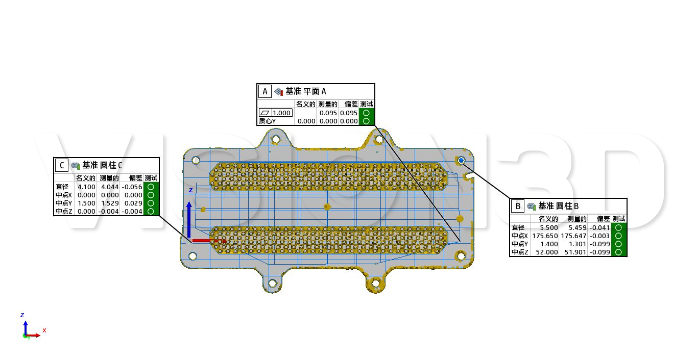 新能源汽車(chē)散熱基板作為電控功率模塊的重要組成部件與核心散熱功能結(jié)構(gòu),其尺寸大小、加工接觸面精度等因素都會(huì)影響到導(dǎo)熱性能及散熱效果,為保證達(dá)到理想的散熱效果,需考慮散熱基板的尺寸大小、厚度及裝配位置等問(wèn)題,因此有必要對(duì)散熱基板進(jìn)行三維檢測(cè)。