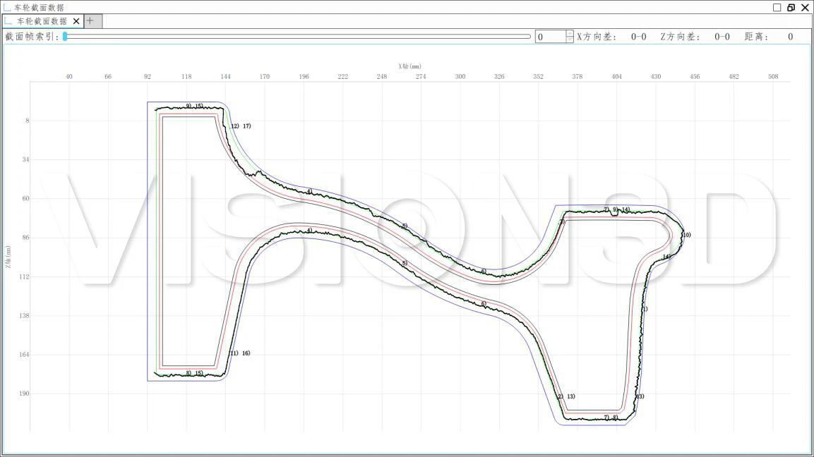 軟件主要窗口界面分為車輪檢測數(shù)模對比界面、車輪二維截面數(shù)據(jù)界面、車輪二維截面尺寸數(shù)據(jù)界面。 三維圖像與二維圖像成對應關(guān)系,在三維圖中可選定任意截面,二維圖中可顯示出該截面的各個尺寸信息。每個車輪可保存500幀高精度截面數(shù)據(jù),數(shù)據(jù)文件小,可通過軟件在任何電腦上離線查看。
