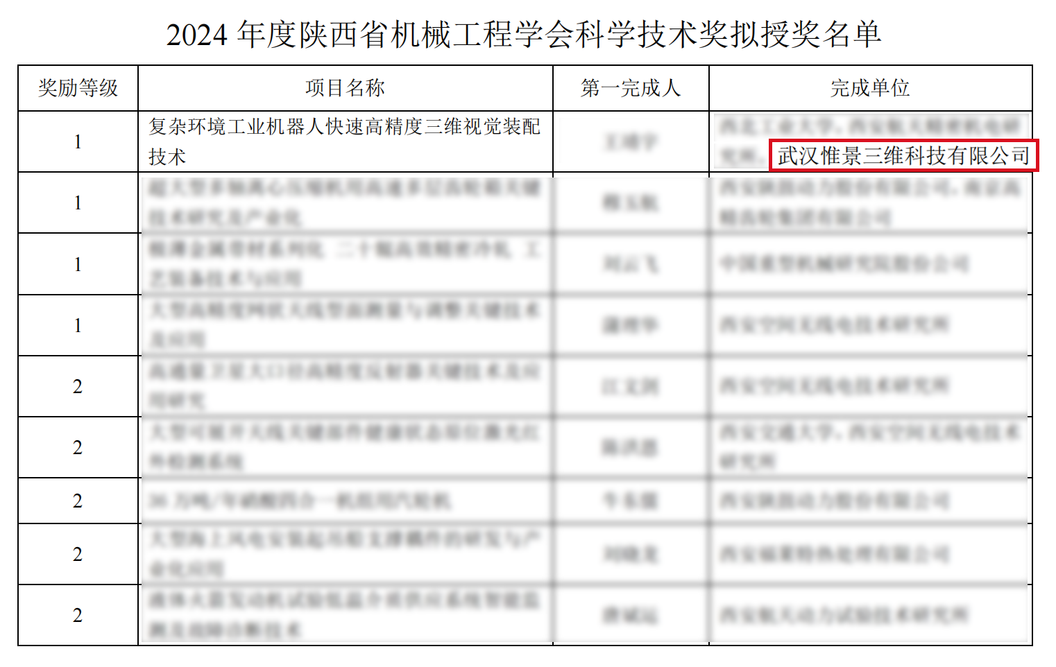 2024年6月,2024年度陜西省機(jī)械工程學(xué)會(huì)科學(xué)技術(shù)獎(jiǎng)名單公示,惟景三維參與申報(bào)的《復(fù)雜環(huán)境工業(yè)機(jī)器人快速高精度三維視覺(jué)裝配技術(shù)》項(xiàng)目榮獲科學(xué)技術(shù)一等獎(jiǎng)。