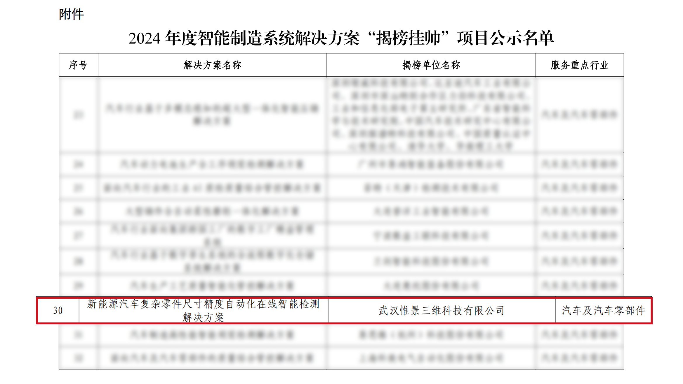 近日,工業(yè)和信息化部公示了2024年度智能制造系統(tǒng)解決方案“揭榜掛帥”項目的入選名單,惟景三維憑借“新能源汽車復雜零件尺寸精度自動化在線智能檢測解決方案”成功入選。