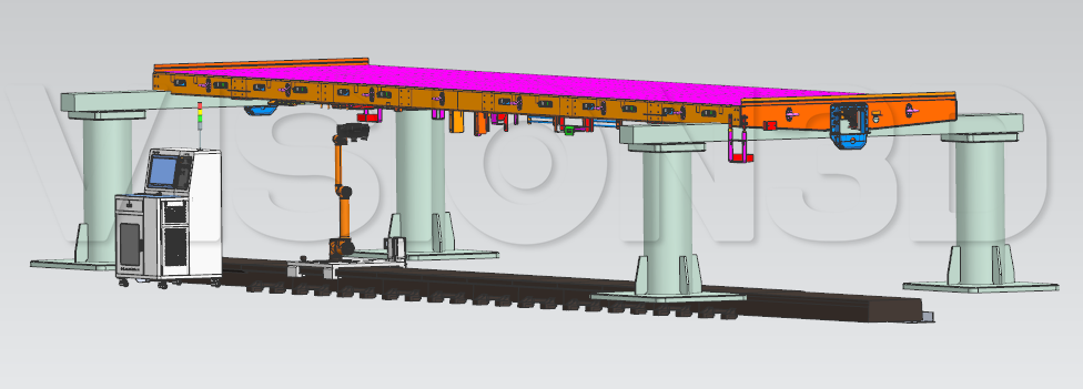 采用惟景三維自主研發(fā)的AutoScan 系列自動(dòng)化三維測量系統(tǒng),利用光學(xué)三維測頭、測量機(jī)械手、導(dǎo)軌、攝影測量系統(tǒng)、三維測量軟件、數(shù)據(jù)處理軟件等一系列集成對(duì)車底架進(jìn)行自動(dòng)化三維檢測。