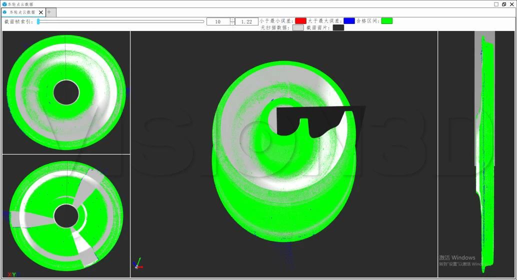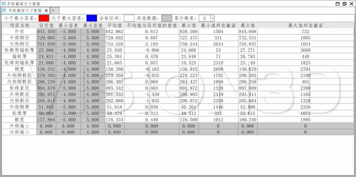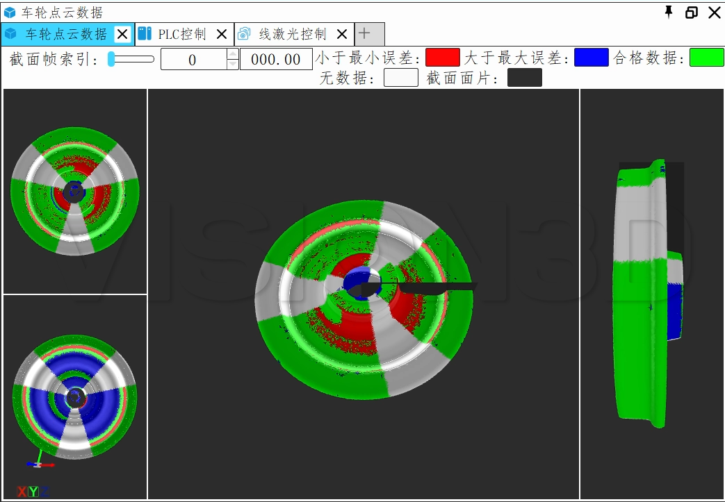 軟件主要窗口界面分為車輪檢測數(shù)模對比界面、車輪二維截面數(shù)據(jù)界面、車輪二維截面尺寸數(shù)據(jù)界面。 三維圖像與二維圖像成對應關(guān)系,在三維圖中可選定任意截面,二維圖中可顯示出該截面的各個尺寸信息。每個車輪可保存500幀高精度截面數(shù)據(jù),數(shù)據(jù)文件小,可通過軟件在任何電腦上離線查看。