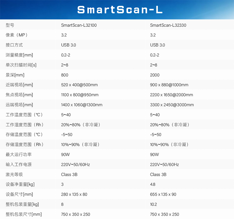 SmartScn-L 3D相機采用自研旋轉激光線掃及先進成像算法,掃描速度快,視野范圍廣,抗環(huán)境光性能優(yōu)異,可在100000LUX光照度環(huán)境下對各種顏色及反光工件高質量成像,兩款不同機型滿足差異化選型需求,有效覆蓋不同范圍、不同距離下各類大型工件的識別、定位、測量等典型應用場景。
