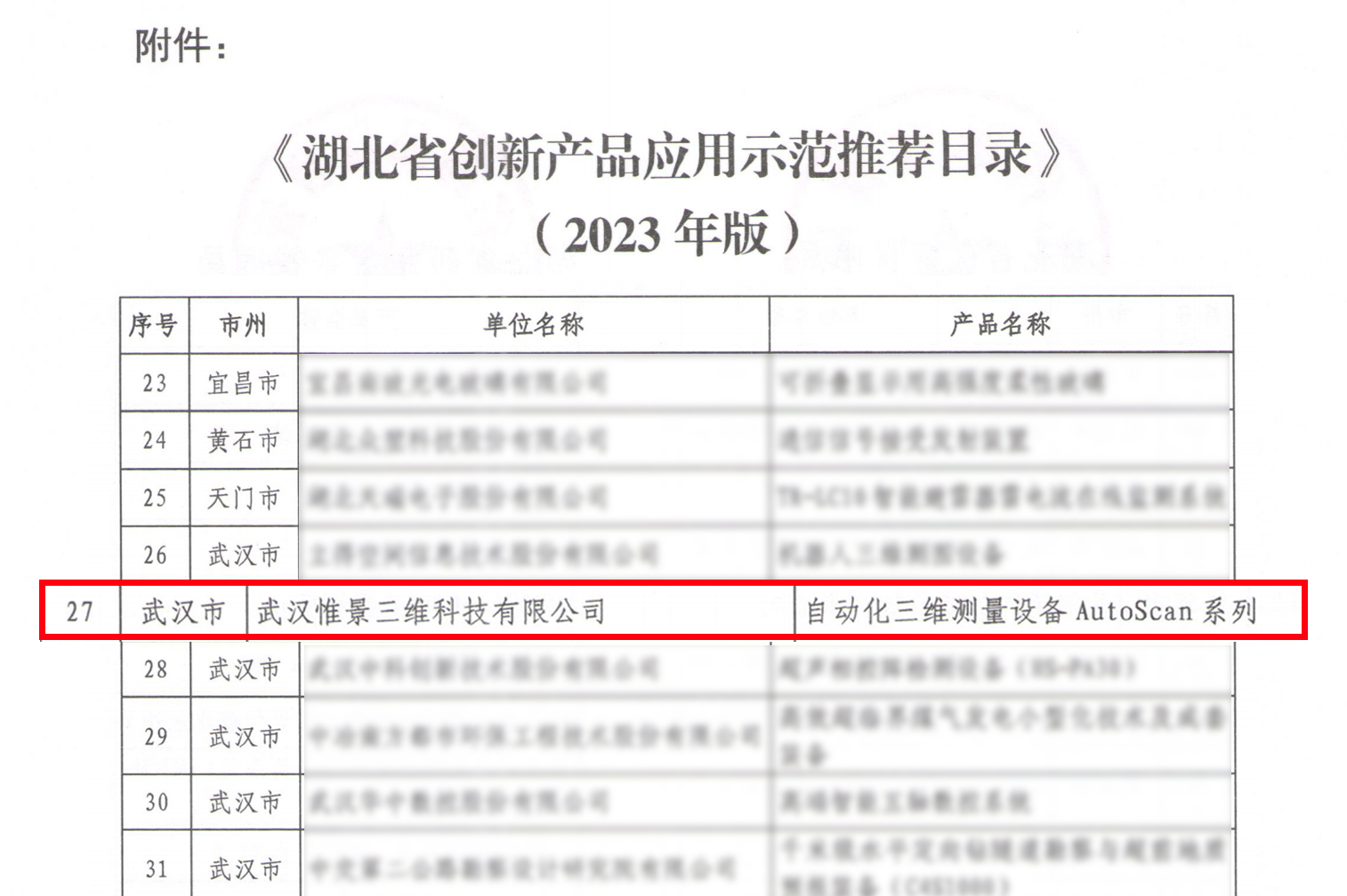 喜訊 | 惟景三維AutoScan系列設(shè)備—成功入選2023湖北省創(chuàng)新產(chǎn)品應(yīng)用示范推薦目錄
