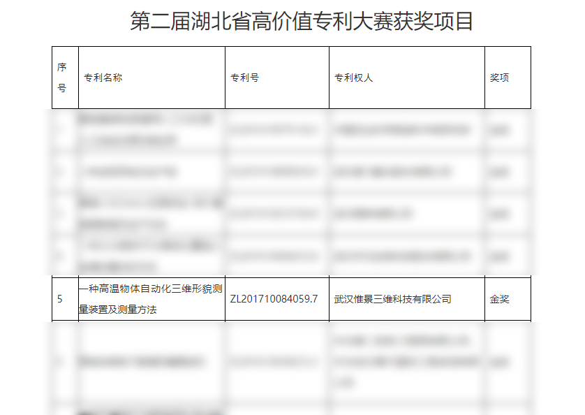 2022年1月17日,湖北省知識(shí)產(chǎn)權(quán)局公布了第二屆湖北省高價(jià)值專利大賽結(jié)果:全省共99項(xiàng)發(fā)明、實(shí)用新型專利獲獎(jiǎng),分別為金獎(jiǎng)21項(xiàng)、銀獎(jiǎng)28項(xiàng)、優(yōu)秀獎(jiǎng)50項(xiàng)。惟景三維以“一種高溫物體自動(dòng)化三維形貌測(cè)量裝置及測(cè)量方法”專利斬獲金獎(jiǎng)。